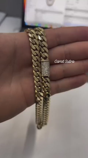 RARE PRINCE by CARAT SUTRA | Solid 10mm Miami Cuban Link Chain with Iced Lock | 22kt Gold Micron Plated on 925 Sterling Silver Chain with AAA+ Quality Swarovski Diamonds | Men's Jewelry | With Certificate of Authenticity and 925 Hallmark